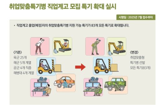 [서울=뉴스핌] 김종원 국방안보전문기자 = 직업계 고등학교 졸업자와 졸업 예정자의 취업맞춤특기병을 지원할 수 있는 특기가 7월 접수부터 83개 모든 특기로 전면 확대된다.
