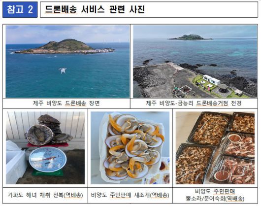 제주도 가파도에서는 해녀들이 당일 채취한 성게알을 제주도 지역 한정으로 7월 중순까지 드론으로 배송할 예정이다. 하루 최대 5㎏, 선착순 10명에 한정해 500g씩 상모리 드론배송거점으로 역배송할 계획이다. 비양도에서는 주민들이 잡은 새조개, 한치, 코끼리조개 등을 금능선착장 드론배송거점으로 역배송을 실시한다.