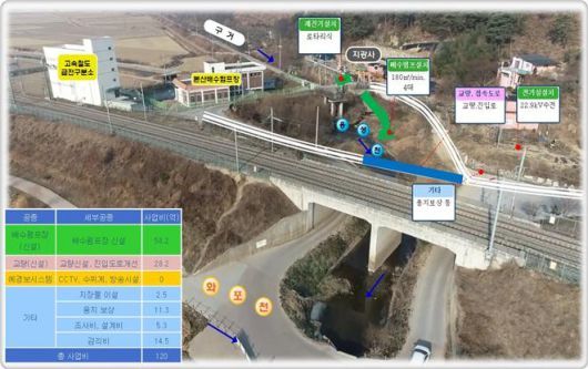 사업비는 국 도비 90억원을 포함한 총 120억원을 투입한다. 이 예산으로 배수펌프 처리용량을 추가로 확보한다. 계획 홍수위보다 낮아 비가 오면 침수되는 도로를 대신할 교량(25m 길이)도 신설한다.
