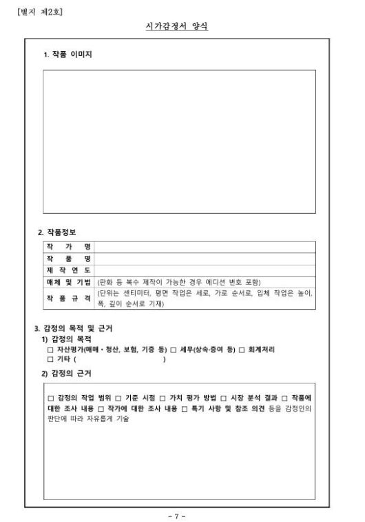 문체부는 연구 용역과 업계 의견수렴 등을 거쳐 감정서 양식을 진위감정서와 시가감정서 2종으로 구분하고, 작품의 기본정보와 감정의 근거 등을 세부적으로 기재하도록 했다.
