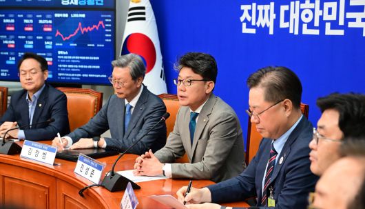 진성준 더불어민주당 정책위의장(왼쪽 세번째)이 6월 30일 오전 서울 여의도 국회에서 열린 경제 6단체와 이재명 대통령 공약 사항인 상법 개정 간담회에 참석해 모두발언하고 있다. 이상섭 기자 |