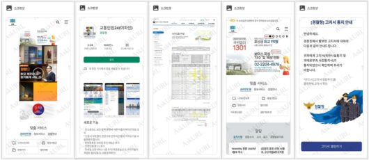 탐지되는 대표적인 공공기관 사칭 피싱 유형으로 △경찰청 사칭 범칙금 고지서 통지 피싱 △경찰청 교통민원 앱 사칭 피싱 △대검찰청 공식 웹사이트 사칭 피싱 △법무부 형사사법포털 사이트 사칭 피싱 등이 있다.