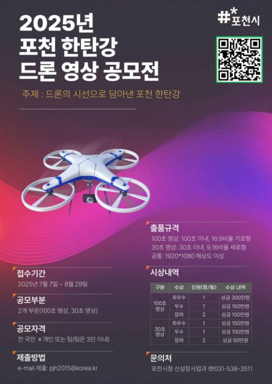 총상금은 1000만원이며, 수상작은 오는 10월 열리는 '포천 한탄강 세계드론제전' 현장에서 상영될 예정이다. 아울러 포천시청 공식 유튜브, SNS, 관광홍보물 등 다양한 디지털 매체에도 활용된다.