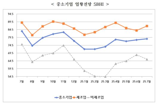 업종별로는 제조업이 87.2로 전월보다 2.9포인트 상승한 반면 비제조업은 65.7로 같은 폭 하락했다. 비제조업 중 건설업은 50.0으로 3.3포인트, 서비스업은 69.3으로 2.5포인트 각각 하락해 부진을 이어갔다.