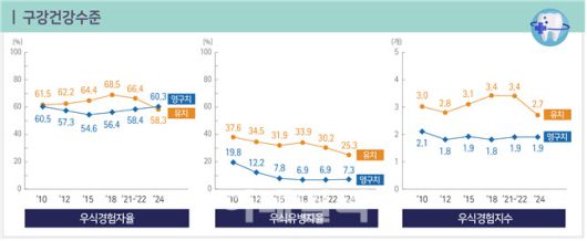 충치에 가장 큰 영향을 미치는 것이 식생활인데 우식(충치) 유발 간식 섭취율(1일 2회 이상, 12세)은 58.1%로 직전 조사(54.9%)대비 3.2%포인트나 높았다. 치아 부식 유발 음료(1일 2회 이상) 섭취율도 2018년 26.7%, 2021~2022년 28.3%, 2024년 29.4%로 해마다 증가하고 있다.
