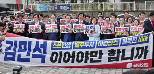 국민의힘은 이날 용산구 전쟁기념관 상징탑 앞에서 김 후보자를 규탄하기 위한 현장 의총을 열었다. 의총 현장엔 "스폰인생, 배추투자, 아빠찬스, 탈북민 비하 김민석이어야만 합니까?"라는 현수막이 내걸렸다.