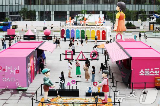 (서울=뉴스1) 장수영 기자 = 1일 오후 서울 종로구 광화문광장에 마련된 넷플릭스 시리즈 오징어게임 시즌3 팝업을 찾은 시민들이 드라마 조형물을 관람하고 있다. 온라인 콘텐츠 서비스 순위 집계 사이트 플릭스 패트롤에 따르면 오징어게임 시즌3는 전날 기준 3일 연속으로 넷플릭스 TV쇼 부문 93개국에서 모두 1위를 차지했다. 2025.7.1/뉴스1
