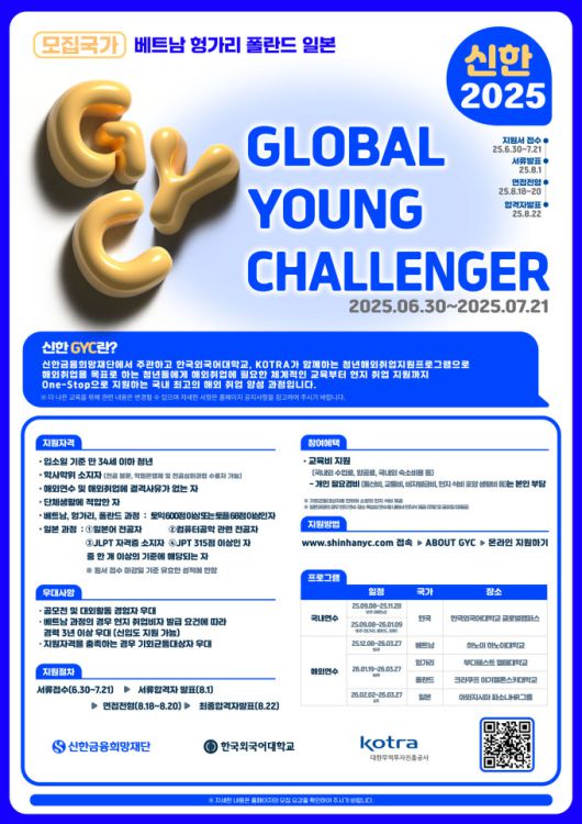 [서울=뉴스핌] 정광연 기자 = 신한금융희망재단(이사장 진옥동)은 오는 21일까지 청년 해외취업 지원 프로그램인 '신한 GYC(Global Young Challenger)' 7기를 모집한다고 1일 밝혔다.