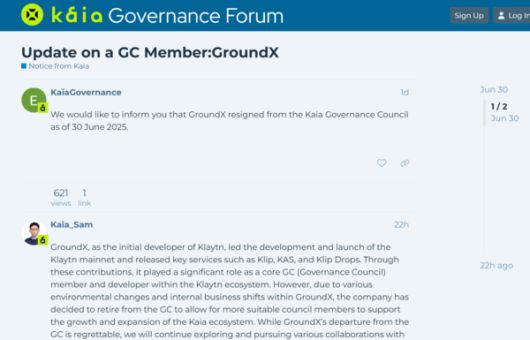 카카오의 블록체인 자회사 그라운드X가 지난 달 카이아의 운영 의사결정을 맡는 '카이아 거버넌스 카운슬(GC)'에서 탈퇴했다. 이를 두고 업계에서는 카카오가 스테이블코인 시장에서 독자적인 행보를 걷는 것 아니냐는 추측을 내놓고 있다.