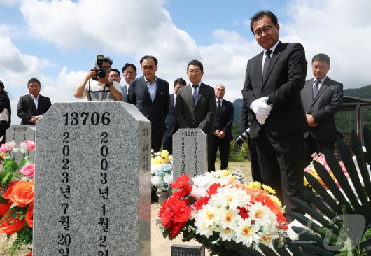 순직 해병 수사 외압 사건을 맡은 이명현 특별검사 등 특검 지휘부가 1일 대전 국립현충원 채상병 묘역을 참배하고 있다. (공동취재) 2025.7.1/뉴스1 ⓒ News1 김기태 기자 |