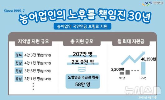 [전주=뉴시스] 윤난슬 기자 = 국민연금공단은 농어업인의 노후소득 보장을 위해 운영하는 '농어업인 연금보험료 지원' 제도가 올해로 시행 30주년을 맞아 누적 지원액 2조9000억원을 돌파했다고 1일 밝혔다.