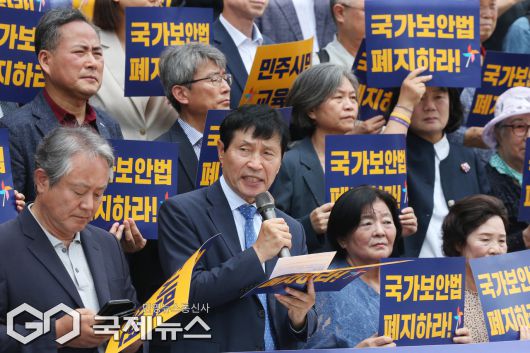 (서울=국제뉴스) 이학영 국회 부의장이 1일 오전 서울 여의도 국회 본청 계단에서 열린 '민주시민 교육을 위한 국가보안법 폐지 1203인 선언 기자회견' 에 참석해 발언하고 있다./사진=이용우 기자