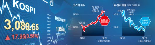 같은 기간(4월~6월) 코스피는 2521포인트(p)에서 3071p로 22% 상승했다. 심리적 저항선으로 여겨졌던 3000선을 넘어선 뒤 지난주 3년 9개월 만에 처음으로 3100선을 돌파하기도 했다. 지난달 25일에는 3108p로 연중 최고점을 기록하는 등 강한 상승세를 이어갔다.