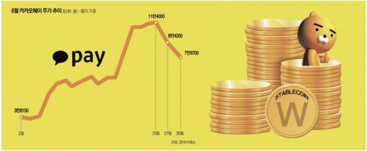 지난달 25일에는 한국은행이 금융안정보고서를 통해 스테이블 코인의 리스크를 공개 저격한 데 이어, 국제결제은행(BIS)도 29일 연례보고서 초안에서 “스테이블 코인이 금융 안정성과 통화 주권 위협을 초래할 수 있다”고 경고하는 등 스테이블 코인을 둘러싼 경계감에 주가 변동성이 급격하게 커지는 모습을 보이기도했다. 거래 해제 이후인 27일 10.23% 급락한 8만4200원에, 30일에는 8.9% 하락한 7만6700원에 거래를 마쳐 약세를 나타냈다. 카카오페이를 비롯해 대부분의 관련주는 지난달 100%가 넘는 주가 상승률을 기록했다가 급등세에 대한 조정을 받아 하락 전환했다.