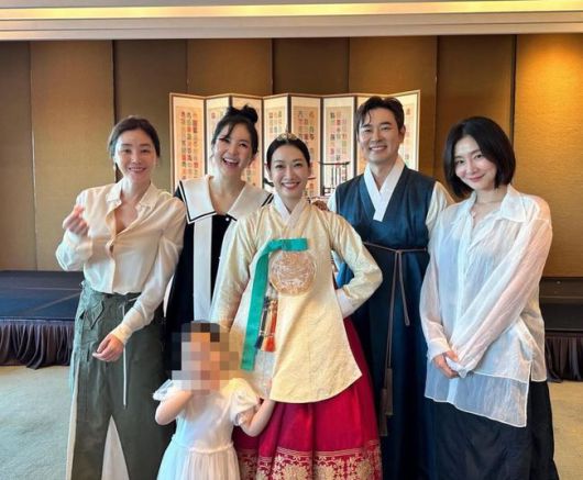 공개된 사진 속 김성령은 한복을 차려입은 김민정 아나운서, 남편 조충현 아나운서, 그리고 지인들과 함께 돌잔치에 참석한 모습.