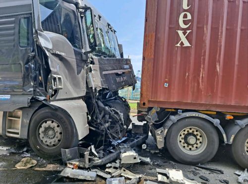 (창원=연합뉴스) 이준영 기자 = 1일 오후 2시께 경남 창원시 진해신항 인근 도로에서 화물 트레일러가 신호 대기 중이던 화물 트레일러를 추돌했다.