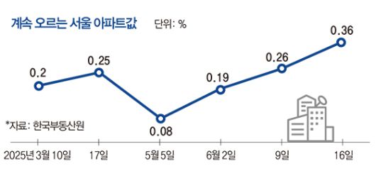 서울 아파트값이 가파르게 오르며 고공행진하고 있다. 주택 공급 절벽과 금리 인하 기조까지 맞물리면서 막 출범한 이재명 정부의 부담이 커지고 있다. 부동산 정책이 첫 번째 시험대에 오르는 형국이다. 한국부동산원이 발표한 6월 셋째주(16일 기준) 주간 아파트 가격 동향에 따르면, 서울 아파트값은 0.36%나 오르며 20주 연속 상승했다. 이는 집값 급등기로 꼽히는 2018년 9월(0.45%) 이후 약 7년 만에 최대 상승폭이다. 현재 서울 부동산 시장이 문재인 정부 시절 수준의 급등세를 보이고 있단 의미다.