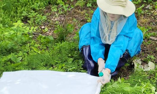 충북보건환경연구원 측이 지난달 중증열성혈소판감증후군 환자 발생지역에서 진드기를 채취하고 있다. 충북도 제공 |