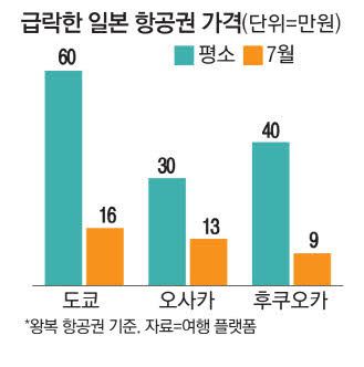 1일 항공·여행업계에 따르면 예약 플랫폼에서 7월 말~8월 초 일본행 저비용항공사의 왕복 항공권이 10만원대 아래에서 판매되고 있다. 같은 기간 서울~제주 간 왕복 항공권이 16만~17만원대인 것을 고려하면 반값으로 일본 여행을 할 수 있는 셈이다. 유후인 등 온천 접근성이 좋은 후쿠오카의 경우 이달 20일 전후 인천발 왕복 항공권 가격은 고작 9만원대다.