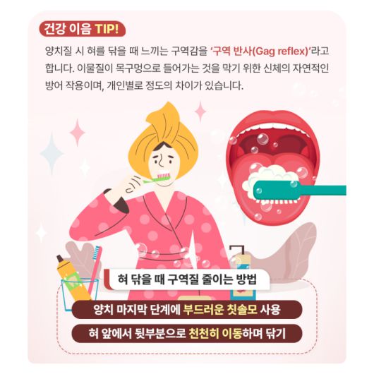 양치질 시 혀를 닦을 때 느끼는 구역감을 '구역 반사(Gag reflex)’라고 합니다. 이물질이 목구멍으로 들어가는 것을 막기 위한 신체의 자연적인 방어 작용이며, 개인별로 정도의 차이가 있습니다.