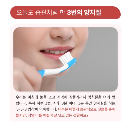 우리는 아침에 눈을 뜨고 저녁에 잠들기까지 양치질을 여러 번 합니다. 특히 하루 3번, 식후 3분 이내, 3분 동안 양치질을 하는 '3‧3‧3 법칙’에 익숙합니다. 대부분 이렇게 습관적으로 칫솔을 손에 들지만, 정말 이를 깨끗이 잘 닦고 있는 것일까요?