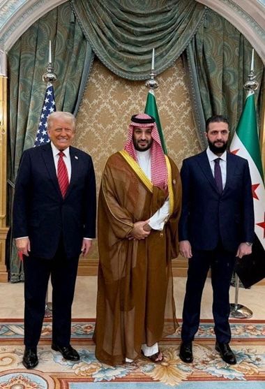 사우디아라비아 리야드에서 지난 5월 14일(현지시간) 도널드 트럼프 미국 대통령(왼쪽),무함마드 빈살만 사우디 왕세자, 아메드 알샤라 시리아 대통령(오른쪽)이 취재진 앞에서 포즈를 취하고 있다./로이터 연합 |