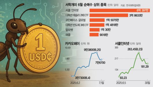 개인투자자들은 미국 시장에서도 스테이블코인 관련 주를 적극 매수하고 있다. 지난달에는 서클인터넷그룹을 6억 397만 달러(약 8178억 원)어치 순매수했다. 서클은 이 기간 서학개미(해외에 투자하는 개인투자자)가 가장 많이 사들인 종목이다. 지난달 5일 상장했음에도 2위(DIREXION DAILY TSLA BULL 2X SHARES) 대비 매수 규모가 3000억 원가량 많다. 올해 가상자산 관련 종목이 순매수 1위에 오른 것은 지난달이 처음이다.