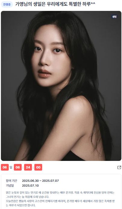 해당 이벤트는 지난달 30일부터 오는 7일까지 운영되며, 문가영의 생일인 7월 10일을 앞두고 팬들의 응원이 이어지고 있다. 1일 오후 5시 40분 기준 600 하트가 모였으며, 이벤트가 시작된 지 오래되지 않아 아직 댓글은 많지 않지만, 팬들의 활발한 참여가 더욱 기대되고 있다.