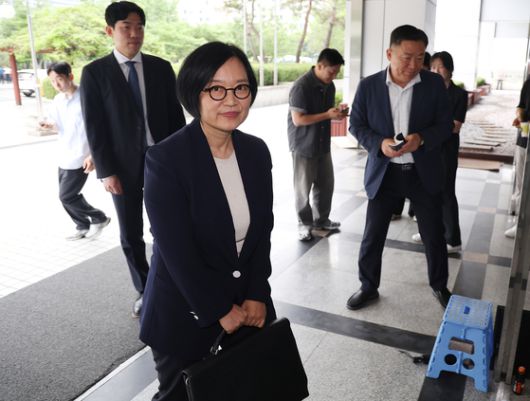 한성숙 중소벤처기업부 장관 후보자가 지난달 26일 서울 영등포구 중소기업기술정보진흥원 수도권평가실에 마련된 인사청문회 준비 사무실로 출근하고 있는 모습. 연합뉴스 |