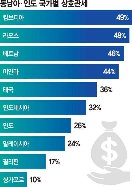 월스트리트저널(WSJ)은 "캄보디아의 태양광 부품이나 베트남산 전자제품처럼 특정 품목에 대해 예외 없이 고율의 보복 관세가 부과될 가능성이 있다"고 경고했다. 실제 일부 품목에는 3000%가 넘는 초고관세가 적용된 사례도 있는 만큼, 트럼프 대통령이 특정 품목에 고관세를 매길 가능성도 제기돼 각국 정부의 워싱턴 정보전이 9일 관세 부과전까지 치열할 것으로 예상된다.