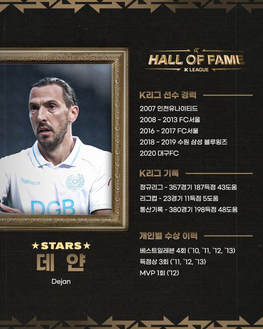 데얀은 외국인 선수 최초로 'K리그 명예의 전당'에 헌액됐다. 데얀은 2007년 인천에서 K리그에 데뷔한 이후 서울, 수원, 대구 등 K리그에서만 총 12년간 활약했다. 데얀은 K리그 통산(리그컵 포함) 380경기 출전, 198골 48도움을 기록하며 최전방에서 압도적인 존재감을 드러냈다.