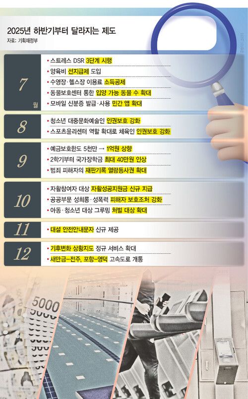 총급여가 7천만원 이하라면 1일 이후 지출한 헬스장·수영장 시설 이용료의 30%를 300만원 한도 내에서 소득공제받을 수 있다. 양육비를 받지 못하고 있는 한부모가족에는 국가가 자녀 양육비를 선지급하는 제도도 이날부터 시작된다. 또 9월부턴 예금보호한도가 기존 5천만원에서 1억원으로 상향된다. 기획재정부는 올해 하반기 정책 변화를 책자로 정리한 ‘2025년 하반기부터 이렇게 달라집니다’를 이날 발간했다. 실생활에 영향을 주는 제도 변화를 중심으로 정리했다.