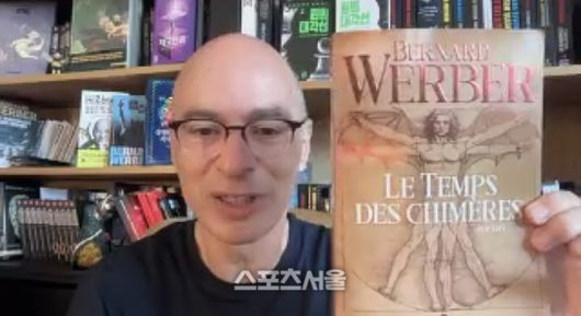 베르나르 베르베르가 1일 온라인 기자간담회에서 신작 ‘키메라의 땅’ 표지의 그림에 대해 설명하고 있다. 사진 | 표권향 기자 gioia@sportsseoul.com |