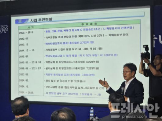 강 시장은 또 "현재 광주는 정부의 민생쿠폰 정책 시행에 따라 1000억 원의 자체 예산 조달이 필요한 상황이지만, 호남고속도로 공사에는 지방채 발행 등 다양한 방안을 통해 재정 확보에 나서겠다"고 말했다.