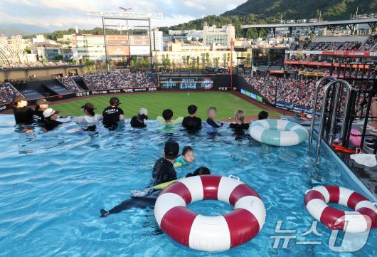 (대전=뉴스1) 김기태 기자 = 1일 오후 대전한화생명 볼파크에서 열린 프로야구 '2025 신한 SOL뱅크 KBO 리그' 한화 이글스와 NC 다이노스 경기에서 관중들이 인피니티 풀에서 경기를 관람하고 있다. 대전한화생명 볼파크 인피니티 풀은 세계 최초 야구장에 설치된 시설로 한화는 1일부터 사흘 동안 시범 운영한 8월 8일부터 일반 팬들에게 정식 공개할 예정이다. 2025.7.1/뉴스1