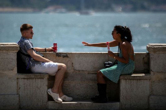 지난 29일(현지시각) 포르투갈 리스본 타구스강 옆에서 두 사람이 음료와 아이스크림을 먹으며 더위를 식히고 있다. 사진 AFP 연합뉴스 |