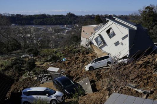 지난 2024년 1월 강진이 발생한 일본 혼슈 중부 이시카와현 가나자와 주택가의 2층집이 뒤로 넘어져 있다. 연합뉴스 |