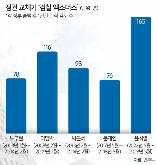 역대 정부 출범 후 1년간 퇴직 검사 수를 보면, 윤석열정부가 출범한 2022년 5월부터 2023년 5월까지 1년간 165명의 검사가 퇴직했다. 문재인·박근혜·이명박·노무현 정부 출범 후 1년간 각각 76명, 93명, 116명, 78명이 옷을 벗었다.