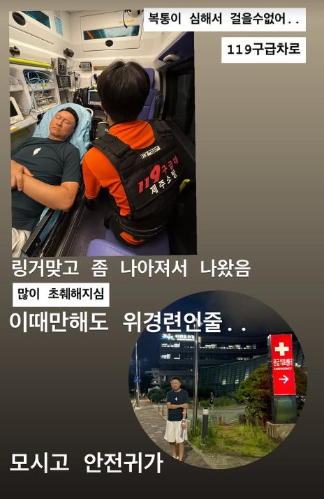 이윤미는 “남편이 복통이 심해 걸을 수 없어 119 구급차로 병원에 갔다”고 밝혔다. 당시 공개된 사진에는 구급차에 누워있는 주영훈의 모습이 담겨있다. 처음에는 위경련으로 진단받고 링거를 맞은 뒤 잠시 호전되어 귀가했으나, 상태는 다시 악화됐다.