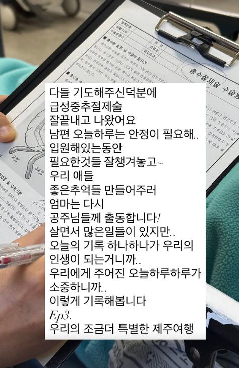 이후 수술이 무사히 끝났음을 알리며 “많은 분들이 기도해주신 덕분에 급성충수절제술 잘 받고 나왔다”고 밝혔다. 이어 “남편은 오늘 하루 안정이 필요해 입원해 있을 것”이라며 “잊지 못할 제주 여행이 되겠다”고 덧붙였다.