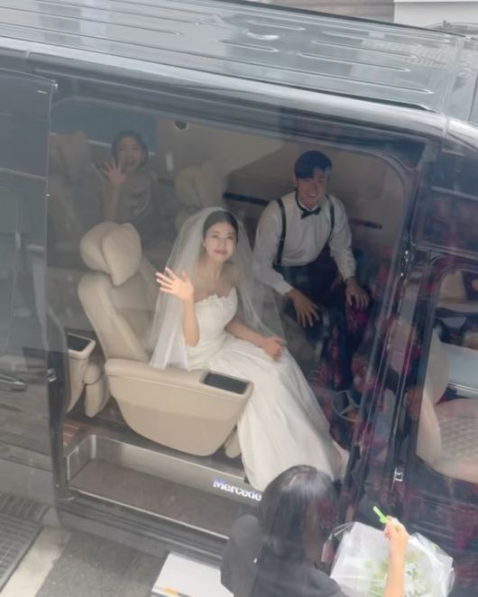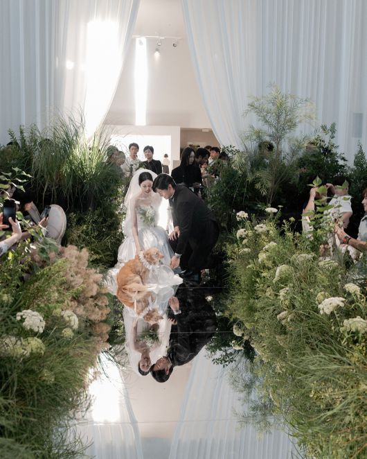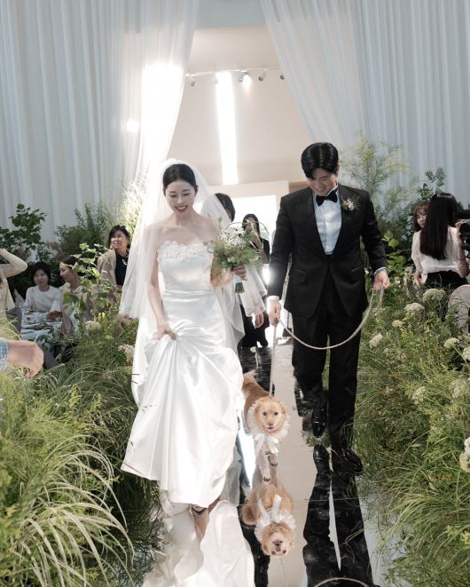 특히 남편과 나란히 버진로드를 걷는 장면에서는 두 사람의 다정한 눈빛과 환한 미소가 눈길을 끈다. 반려견 두 마리도 턱시도와 드레스를 입고 예식에 함께 참석해 특별함을 더했다.