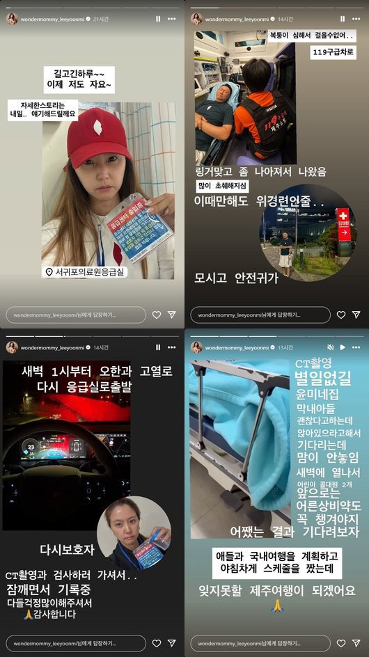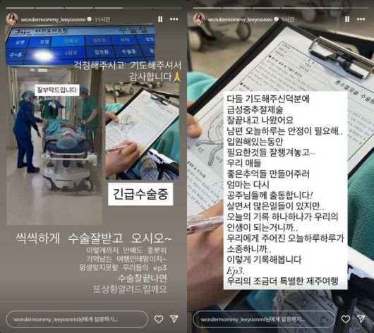 이처럼 이윤미는 남편의 응급 상황부터 수술 과정까지를 자신의 소셜 미디어 스토리를 통해 기록하며 팬들에게 공유했다. 구급차 탑승 장면, 병원 응급실 내부, 남편이 링거를 맞는 모습, 초췌해진 얼굴, 수술실로 들어가는 뒷모습 등을 연달아 올린 것.