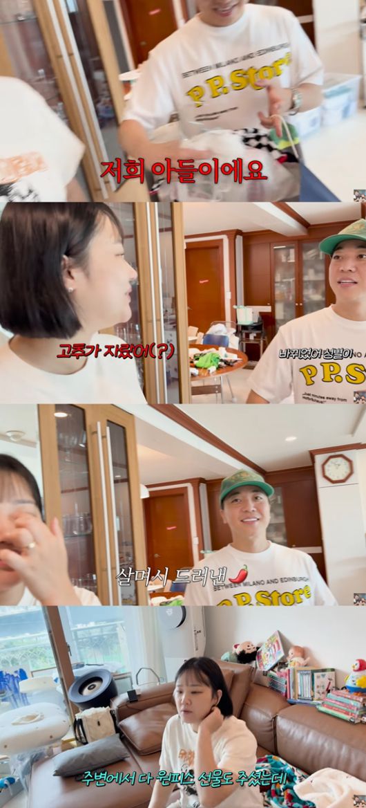 이에 이은형은 "나 진짜 소름 돋았다. 아들 둘 엄마 축하한다"라며 축하를 건넸다. 넉살의 아내는 "저도 아들 둘이 좋습니다"라고 말했다. 이은형은 "당연히 딸인 줄 알고 있다가 아들이라고 하니까 당황스럽긴 하다"라며 놀라움을 감추지 못했다. 넉살의 아내는 "주변에서 벌써 다 원피스 선물도 주셨다"라며 곤란함을 드러냈다.
