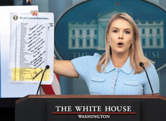 캐럴라인 레빗 미국 백악관 대변인이 지난달 30일 도널드 트럼프 대통령이 제롬 파월 연방준비제도 의장에게 보낸 기준금리 비교표를 들어 보이고 있다. 국가별 기준금리를 낮은 순으로 정리한 이 표에 미국은 35번째로 기재돼 있다. “제롬, 당신은 언제나 너무 늦다”며 기준금리 인하를 재촉하는 트럼프의 자필 메시지도 적혀 있다.