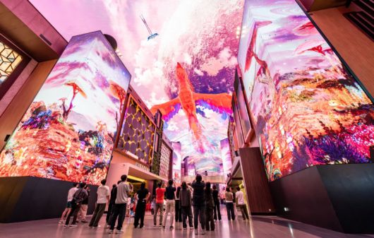 먼 곳으로 여행을 떠나지 않고 도심지 호텔이나 쇼핑몰에서 휴가를 즐기는 이들이 늘고 있다. 지난해 인천 영종도에 정식 개장한 ‘인스파이어 리조트’에는 몰입형 디지털 거리 ‘오로라’가 조성돼 있어 투숙객은 물론이고 방문객들의 눈길도 사로잡고 있다. 인스파이어 리조트 제공 |