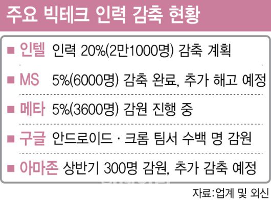업계 전문가들은 MS와 메타, 인텔, 구글 등 주요 빅테크 기업들의 추가 감원이 예상되면서 올해 상반기 해고 인원이 최대 8만명에 달할 것으로 추산했다. MS는 지난 5월 6000~7000명을 감원한 데 이어 이달 초 수천명을 추가 감원하는 구조 조정을 추진할 예정이다.