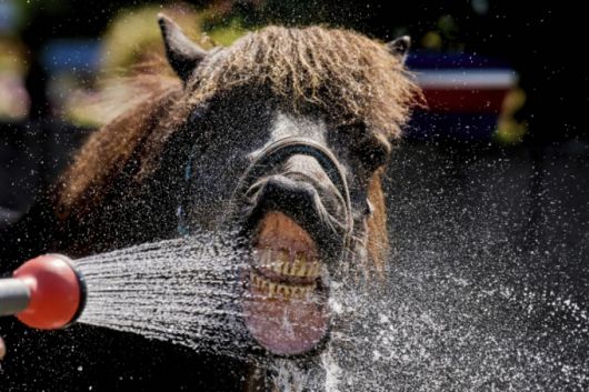 30일(현지시간) 폭염이 덮친 독일 프랑크푸르트 인근 베르하임의 한 종마장에서 아이슬란드 말이 물 호스로 물을 마시고 있다. /AP=뉴시스 |