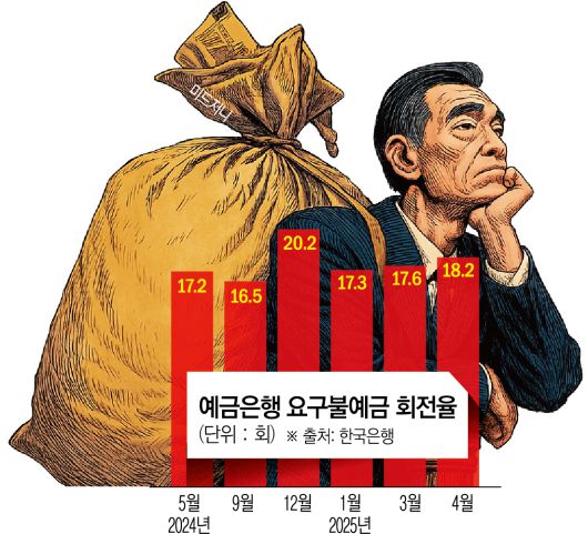 단기성 자금뿐 아니라 장기성 자금의 흐름도 바뀌고 있다. 같은 기간 저축성예금(정기예금·적금 등) 회전율은 1.4회로 지난해 12월(1.5회) 이후 4개월 만에 가장 높은 수준이다. 금리가 내려가면 만기 도래 후 재예치 대신 다른 투자처로 자금을 돌리는 경향이 커지기 때문이다. 한 시중은행 관계자는 “저축성예금 회전율이 높아진 것은 장기 자금조차 은행에 오래 묶이지 않는다는 의미”라며 “기준금리가 더 내려가면 자금 이동 속도는 더 빨라질 수 있다”고 말했다.