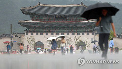 (서울=연합뉴스) 김도훈 기자 = 서울 지역에 소나기가 내린 16일 서울 광화문광장에서 우산을 쓴 관광객 및 시민이 길을 지나고 있다. 2025.6.16 superdoo82@yna.co.kr