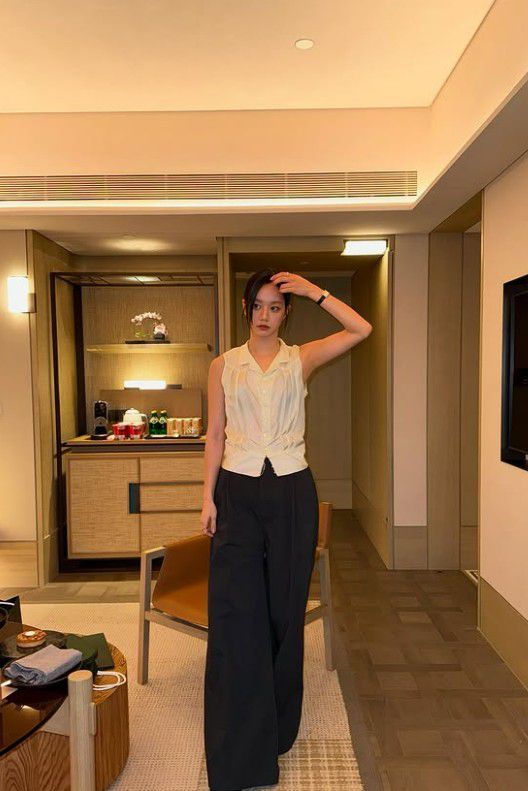 또 다른 스타일에서는 크림 컬러 민소매 셔츠에 여유로운 실루엣의 와이드 슬랙스를 매치해 세련된 클래식함을 연출했다. 소재의 흐름을 살린 자연스러운 핏과 톤온톤의 컬러 배치는 편안하면서도 단정한 무드를 자아내며 고급스러움을 배가시켰다.
